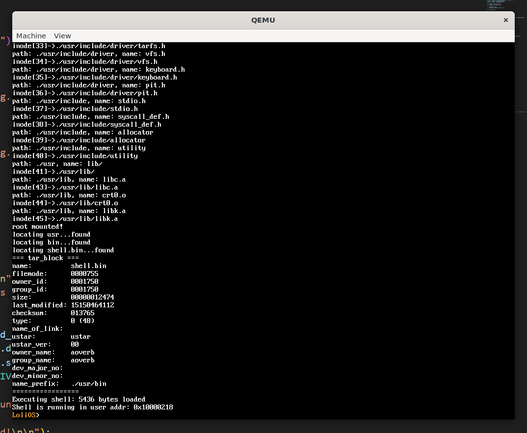 自制操作系统(16):tarfs 上一节我们说完了抽象的vfs,这一节我们来讲讲具体的tarfs。 tar文件 tar文件其实早期是用于在磁带上组织文件的文件系统。所以解析这个文件很简单,既然文件的记录方式是顺序记录,我们可以用一次循环把里面的所有东西读取出来。我们以512字节为单位解析,解析一个头出来,获取大小,偏移512+大小字节,就是下一个头,直到读到空文件名。 typedef struct { char name[100]; char filemode[8]; char owner_id[8]; char group_id[8]; char size[12]; char last_mo […]